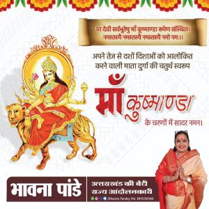 देहरादून। उत्तराखण्ड की बेटी, राज्य आंदोलनकारी एवं प्रसिद्ध समाजसेवी भावना पांडे ने ‘शारदीय नवरात्रि’ के चतुर्थ दिवस पर माँ के चतुर्थ स्वरूप माता कुष्मांडा की आराधना के पावन अवसर पर सभी श्रद्धालुओं और समस्त देश वासियों को हार्दिक बधाई व शुभकामनाएं दी हैं।