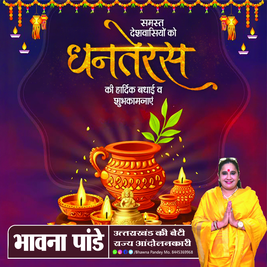 वरिष्ठ राज्य आंदोलनकारी भावना पांडे ने कहा कि इस धनतेरस पर आपके जीवन में ढ़ेर सारी सफलता आये। प्रगति पर आपका कारोबार हो, घर में सुख-शांति का विस्तार हो और हर संकट का नाश हो, ऐसा आपका धनतेरस का त्योहार हो।