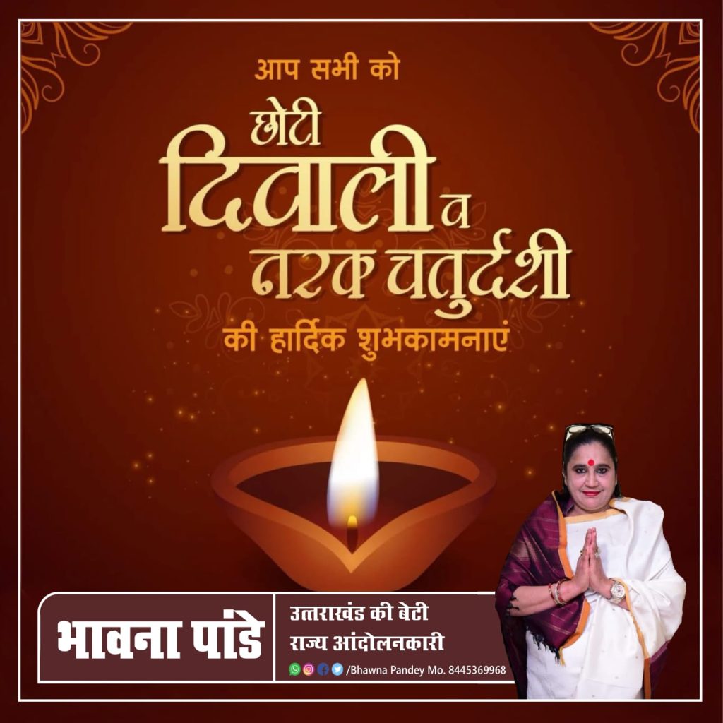 देवभूमि की बेटी भावना पांडे ने नरक चतुर्दशी, रूप चतुर्दशी एवँ छोटी दिवाली के पावन पर्व के अवसर पर अपने संदेश में कहा- “आप सभी को नरक चतुर्दशी, रूप चौदस, काली चतुर्दशी व छोटी दिवाली की हार्दिक बधाई एवँ शुभकामनाएं।”