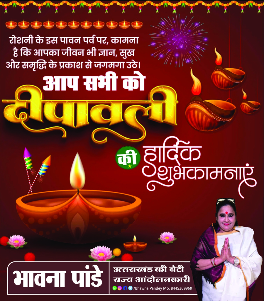 उत्तराखंड की बेटी भावना पांडे ने दिवाली के पावन अवसर पर जारी अपने संदेश में कहा- आप सभी को दीपावाली की हार्दिक बधाई एवँ शुभकामनाएं। सत्य, सनातन, सदाचार और सकारात्मकता की शाश्वत विजय के पावन प्रतीक महापर्व दीपावली के अवसर पर आप सभी के जीवन में विश्वास, उत्साह और उमंग का दीप प्रज्वलित हो, यही प्रार्थना है।