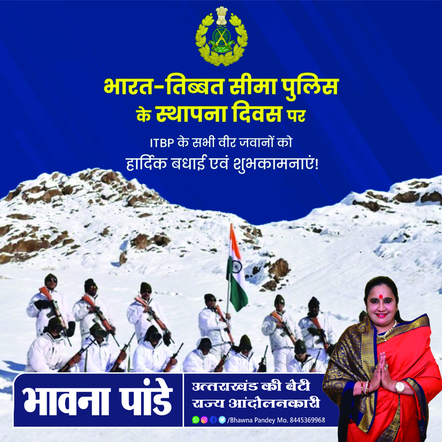 इस अवसर पर जारी अपने संदेश में उत्तराखंड की बेटी भावना पांडे ने कहा- भारत–तिब्बत सीमा पुलिस बल के स्थापना दिवस पर आईटीबीपी के सभी ‘हिमवीरों’, उनके परिवार जनों और समस्त देशवासियों को हार्दिक बधाई एवं शुभकामनाएं!