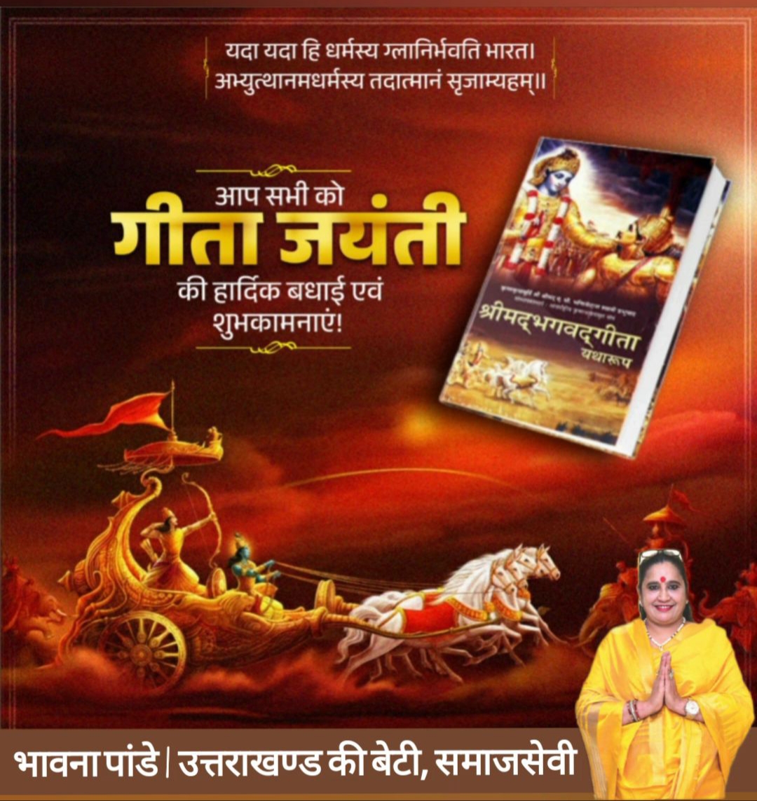 देहरादून। उत्तराखण्ड की बेटी, राज्य आंदोलनकारी एवं प्रसिद्ध समाजसेवी भावना पांडे ने “गीता जयंती” के पावन अवसर पर समस्त देशवासियों को हार्दिक बधाई एवं शुभकामनाएं दी हैं।