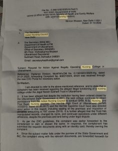 निदेशालय चिकित्सा शिक्षा की केंद्रीय विजिलेंस के निर्देश के आधार पर हाई लेवल जांच समिति में रास बिहारी बोस सुभारती यूनिवर्सिटी के नर्सिंग कॉलेज के 2020 से 2025 तक के एडमिशन अवैद्य घोषित किए। छात्रों एवं अभिभावकों ने धामी सरकार को कोसा। मचा हड़कंप